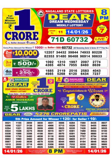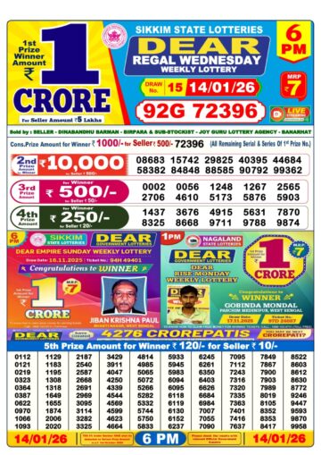 Dear Lottery Result 14.01.26 6PM Today Dear Day Result
