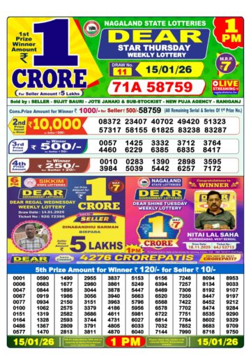 Dear Lottery Result 15.01.26 1PM Today Dear Morning