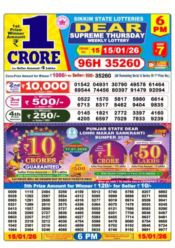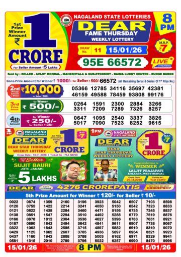Dear Lottery Result 15.01.26 6PM Today Dear Day Result
