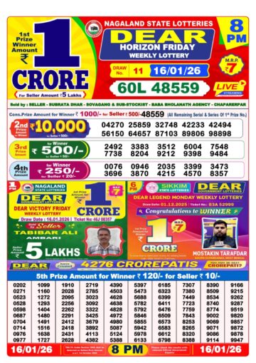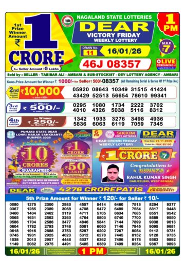 Dear Lottery Result 16.01.26 1PM Today Dear Morning