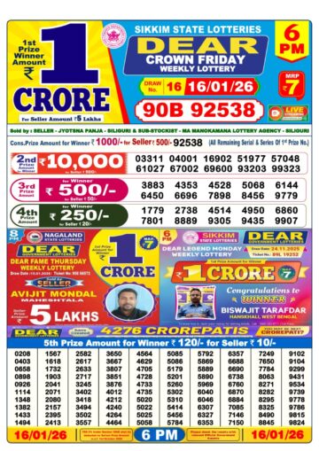 Dear Lottery Result 16.01.26 6PM Today Dear Day Result