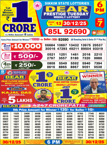 Dear Lottery Result 30.12.25 6PM Today Dear Day Result