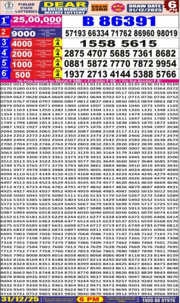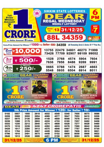 Dear Lottery Result 31.12.25 6PM Today Dear Day Result