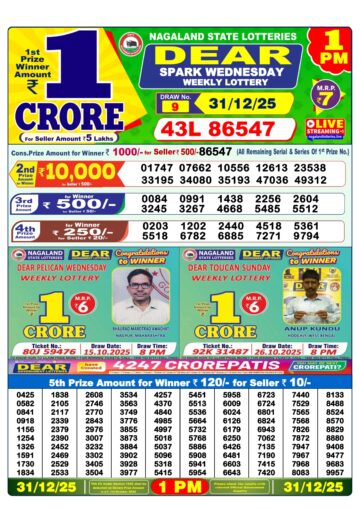 Dear Lottery Result 31.12.25 1PM Today Dear Morning