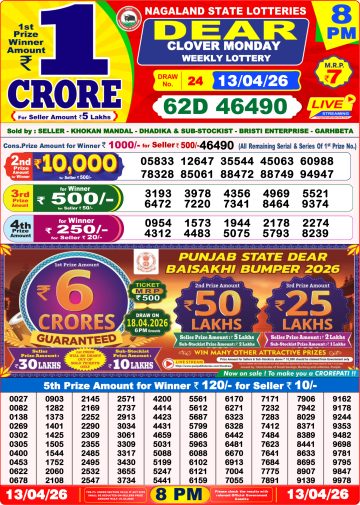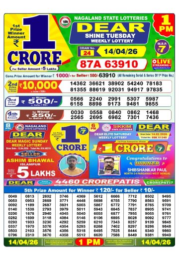Dear Lottery Result 14.04.26 6PM Today Dear Day Result