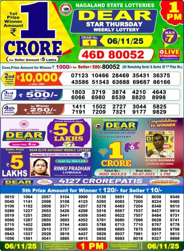 • Dear Lottery Result 06.11.25 6PM Today Dear Day Result