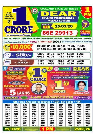 Dear Lottery Result 25.03.26 1PM Today Dear Morning