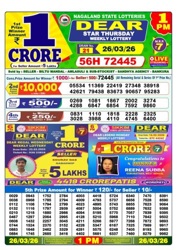 Dear Lottery Result 26.03.26 1PM Today Dear Morning