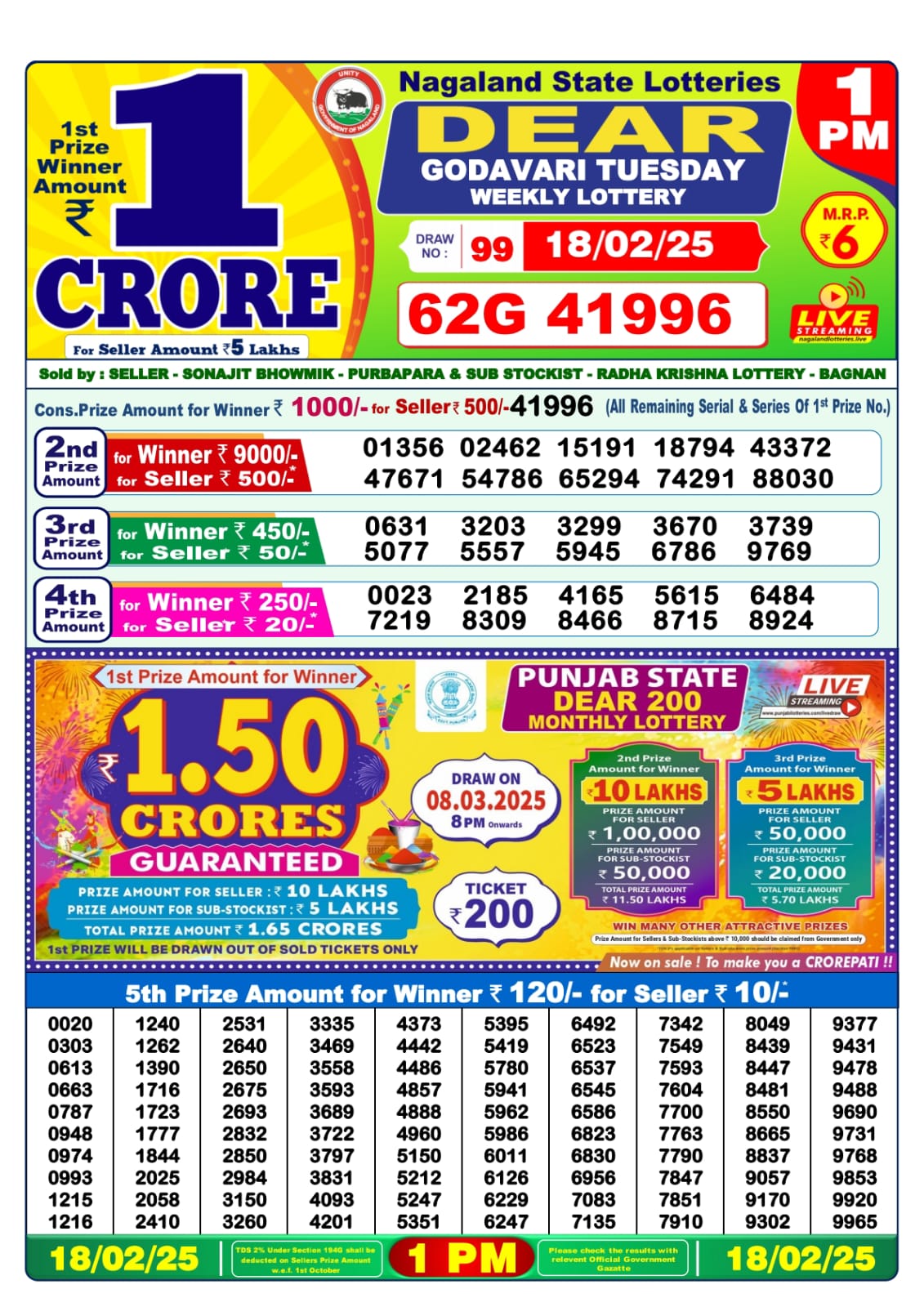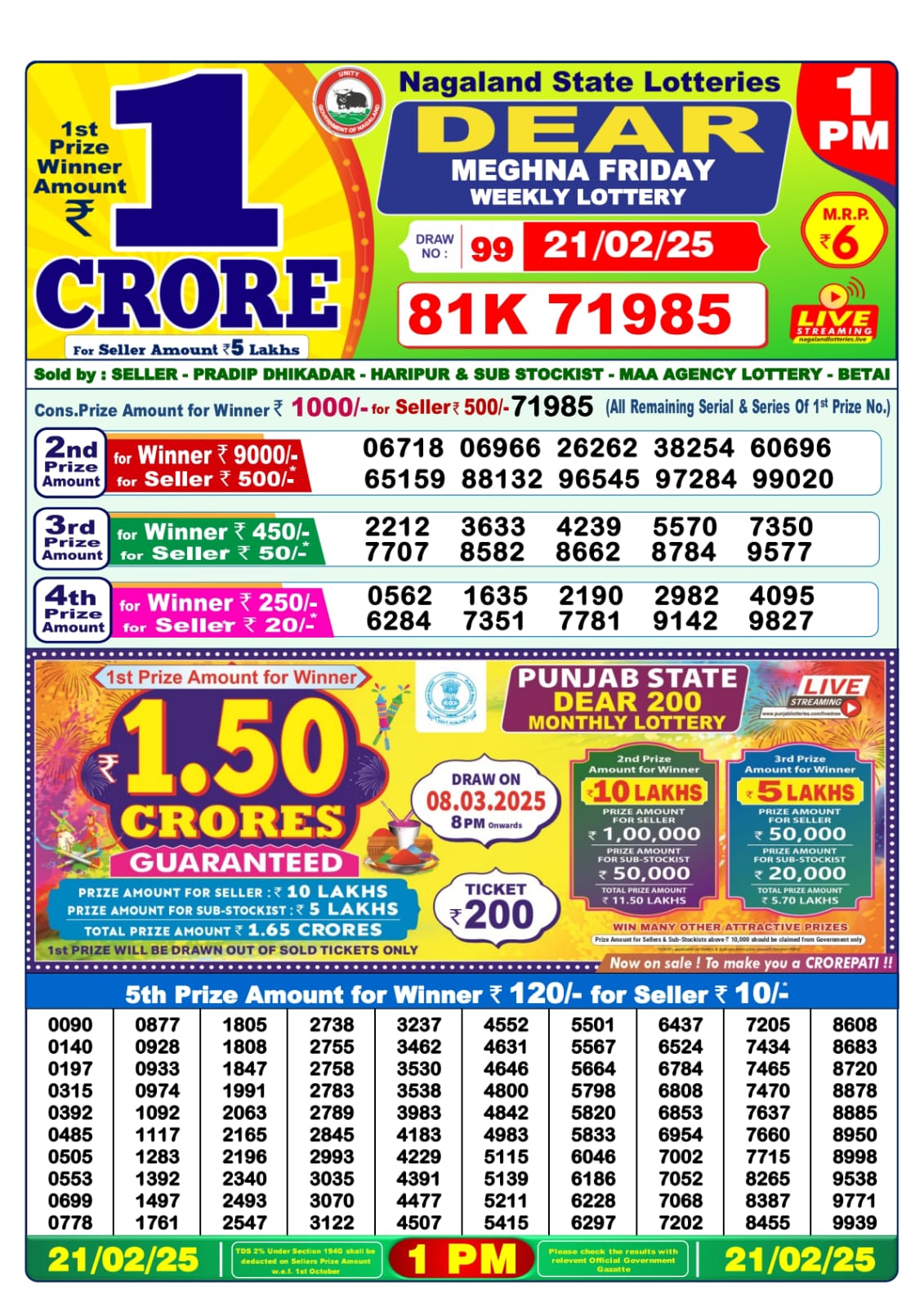 Dear lottery result today 1pm 10.2.25