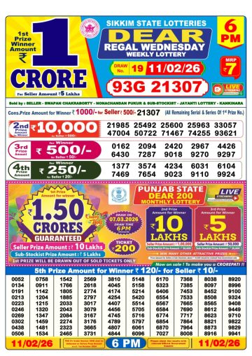 Dear Lottery Result 19.02.26 6PM Today Dear Day Result