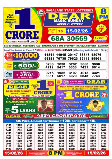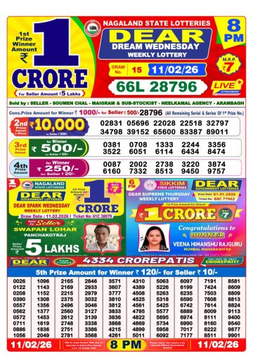 Dear Lottery Result is Published here. Check Lottery Sambad Result 8 PM . Dear 8PM Lottery is Conducted by Nagaland state Lotteries and is also called 6 Rupees 1 Crore Lottery. This Lottery is also known at Dear Evening Lottery. You can check Lottery Sambad 8 PM Results for this draw here including complete winner list.