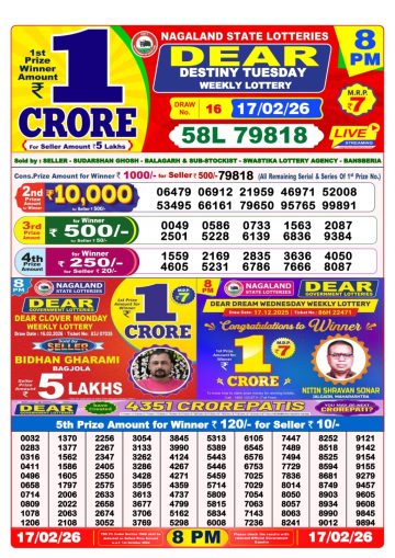 Dear Lottery 8pm Declared 17.02.26 Lottery Sambad Evening