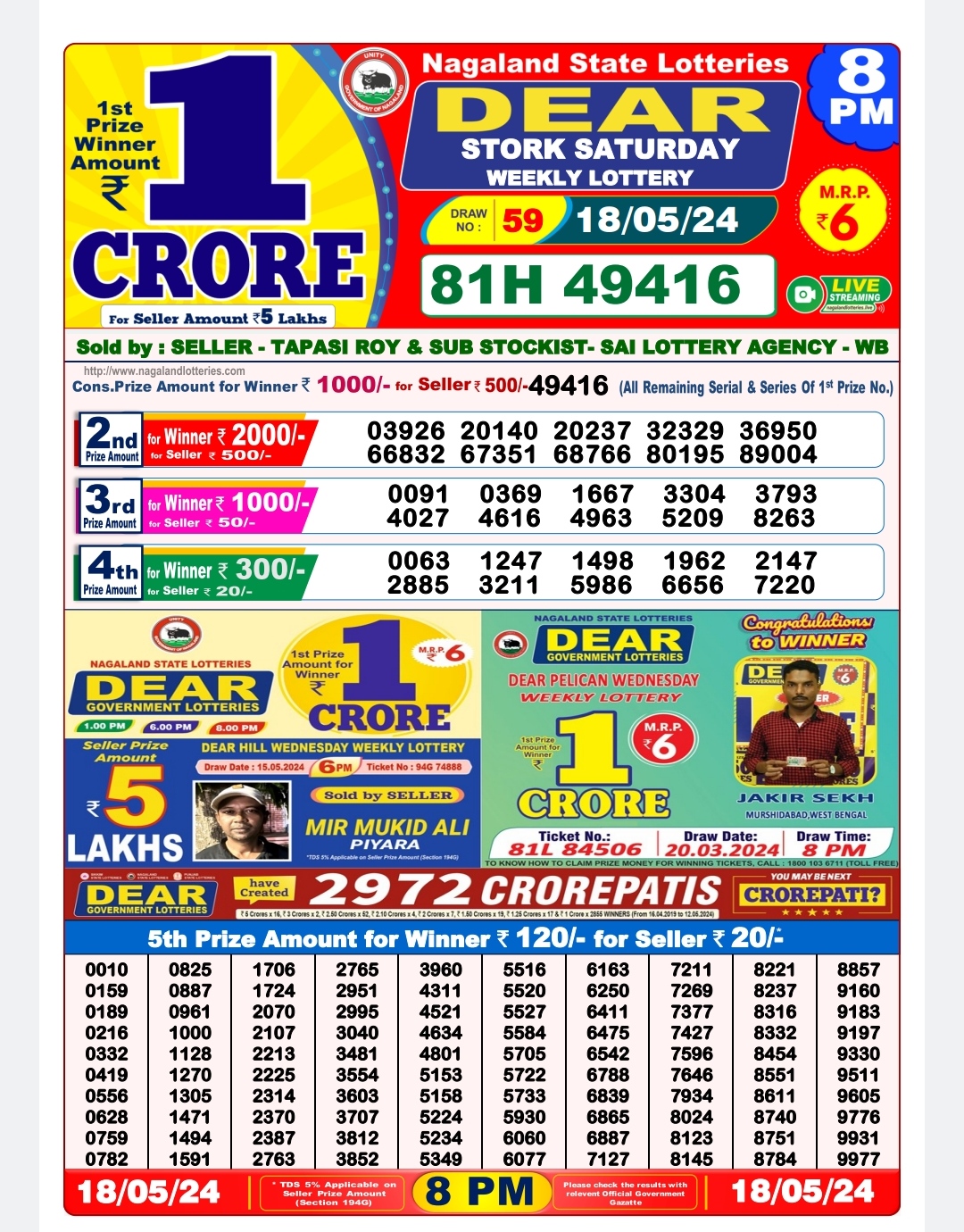 • Dear Lottery 8pm Declared 18.03.26 Lottery Sambad Evening