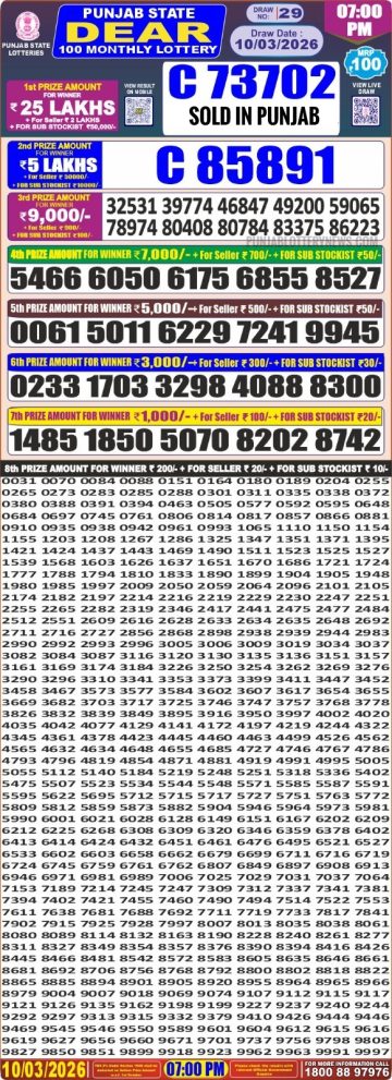 Punjab State Dear 100 Monthly 7 PM Lottery Result 13.01.26