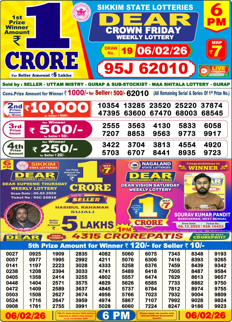 Dear Lottery Result 06.02.26 6PM Today Dear Day Result Share: XFacebookPinterestRedditVKDiggLinkedinMix Related Results 0 4 Dear Lottery Result 07.02.26 6PM Today Dear Day Result 0 19 Dear Lottery Result 05.02.26 6PM Today Dear Day Result 0 27 Dear Lottery Result 04.02.26 6PM Today Dear Day Result 0 41 Dear Lottery Result 03.02.26 6PM Today Dear Day Result