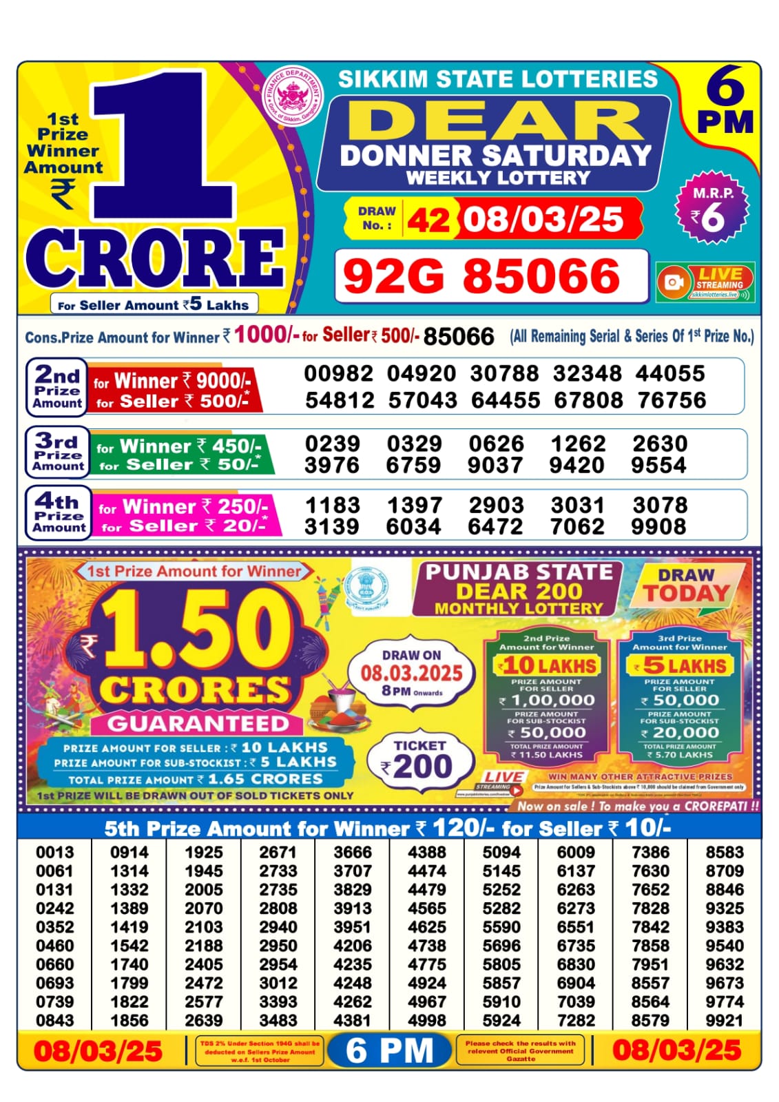Punjab state dear 10 lottery result 6 p.m. 8.03 2025