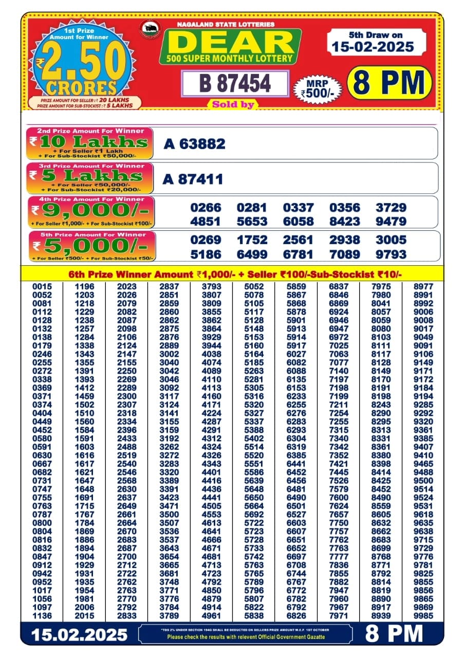 Dear 500 Super Monthly Lottery Result Today 15.2.2025
