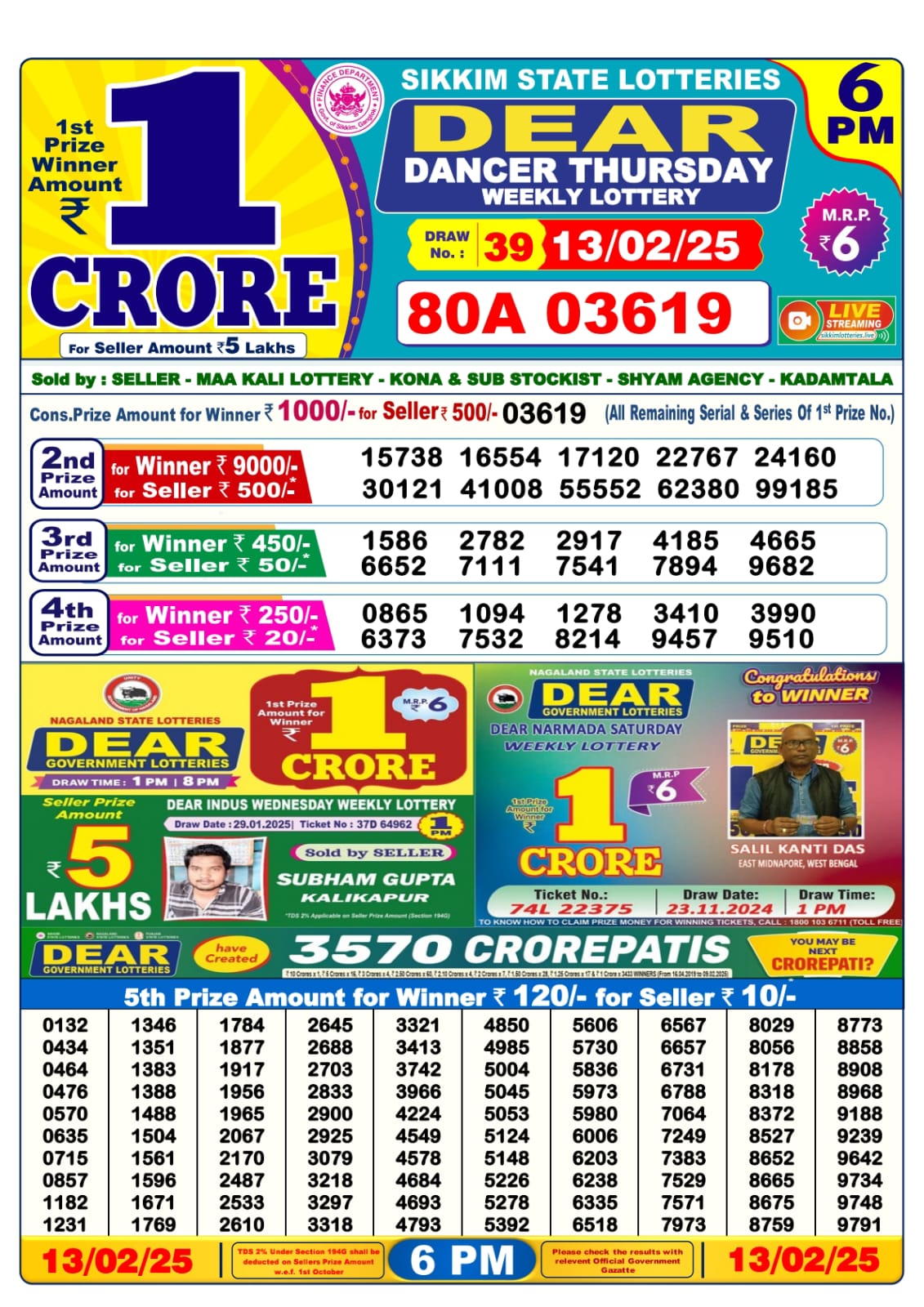 Dear lottery result today 6 p.m. 13.2 25