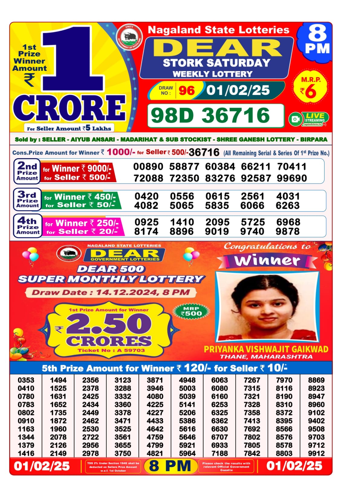 Dear lottery result today 6pm 1.2.25