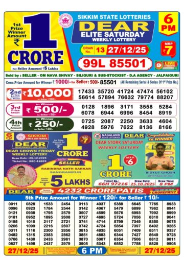 Dear Lottery Result 27.12.25 6PM Today Dear Day Result