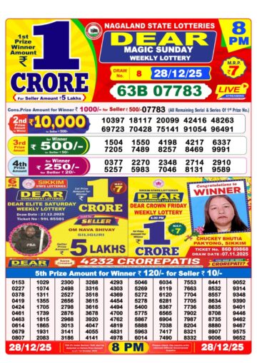 Dear Lottery Result 28.12.25 6PM Today Dear Day Result