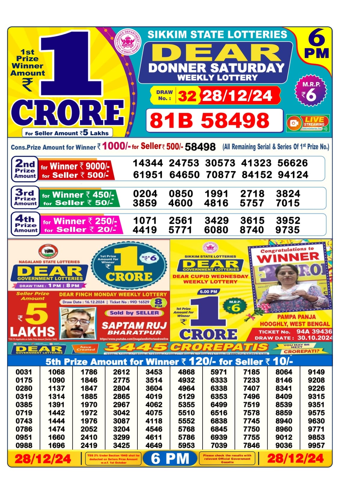 Punjab state dear10 lottery result 6pm 28.12.2024