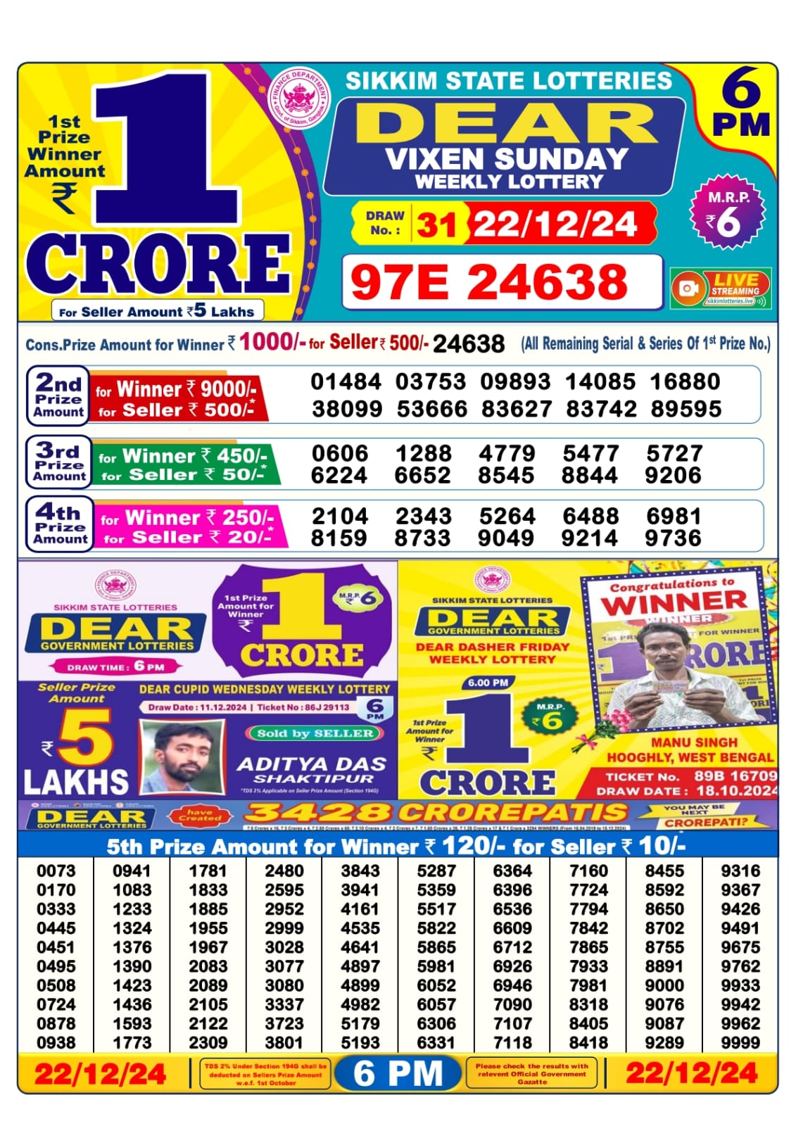 Punjab state dear10 lottery result 6pm 23.12.2024