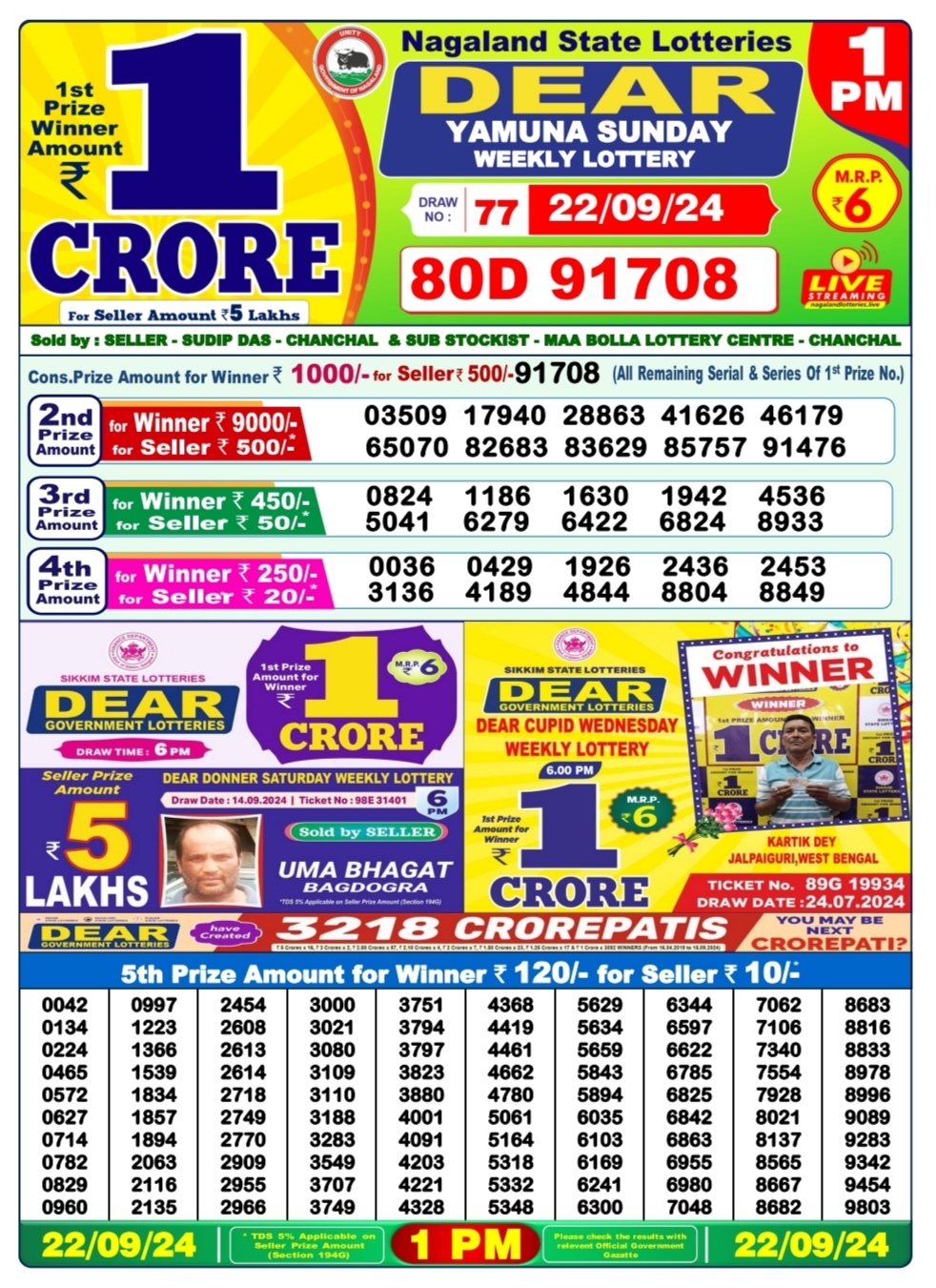Dear 1pm lottery result 22-9-24