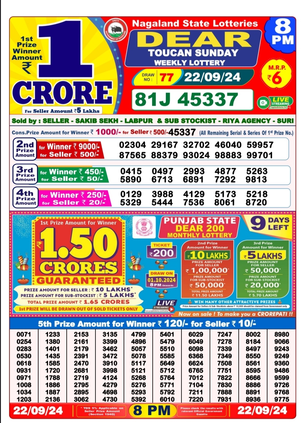 Dear super 7pm lottery result 22-9-24