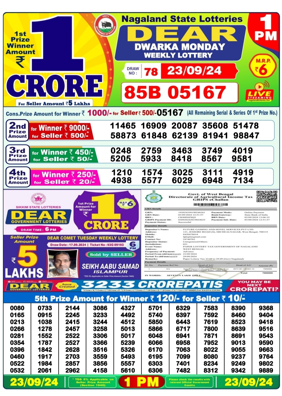 Dear 1pm lottery result 23-9-24