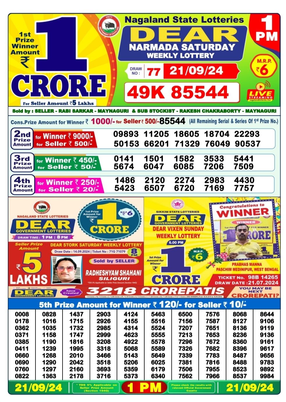 Dear 1pm lottery result 21-9-24
