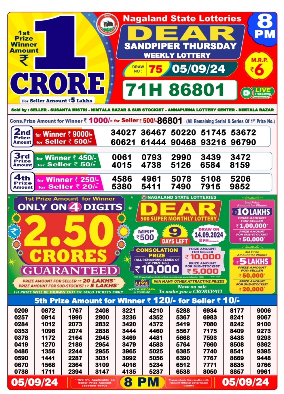 Dear Lottery Result 09.11.25 6PM Today Dear Day Result