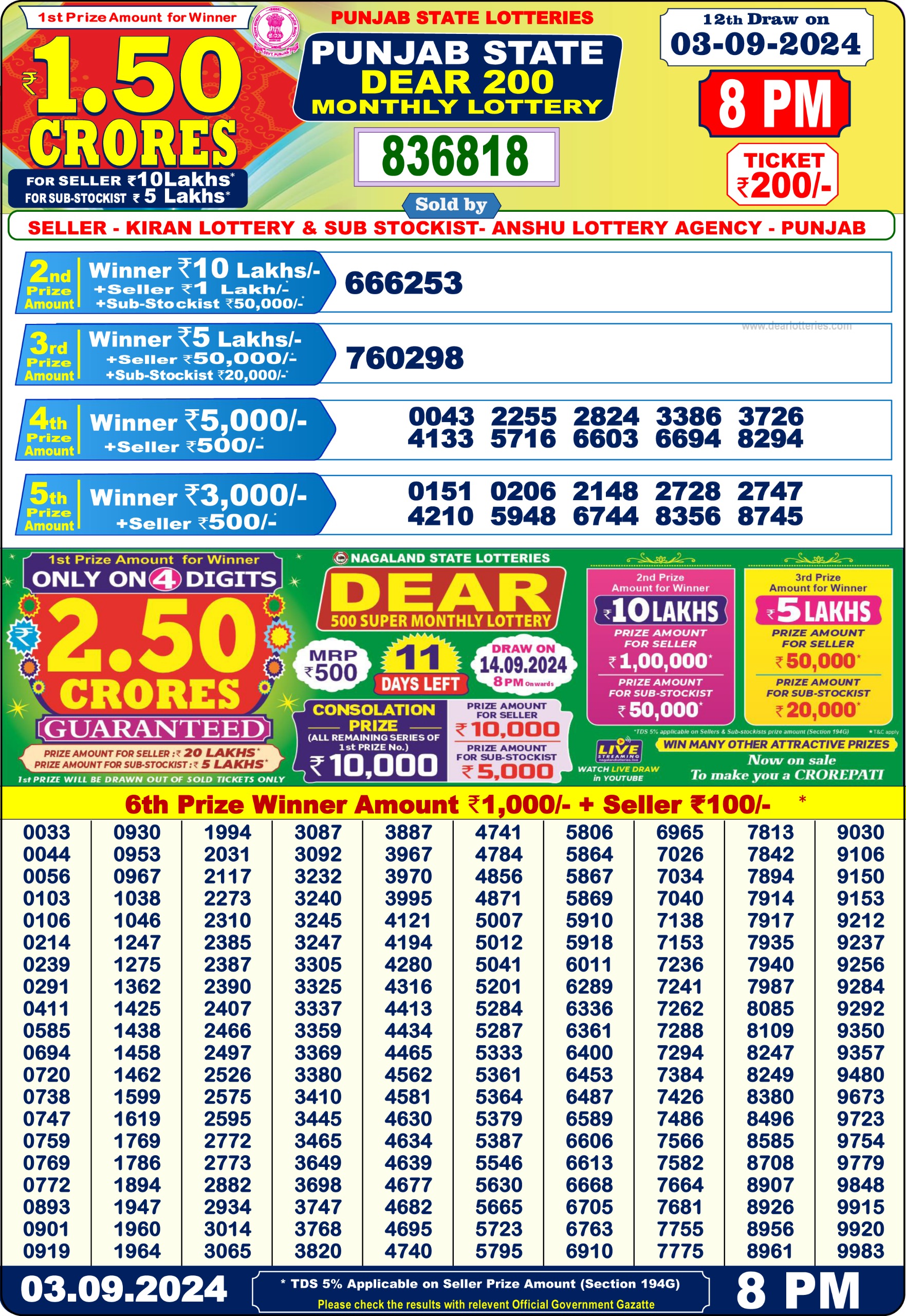 Punjab state dear200 8pm monthly lottery result 3-9-24