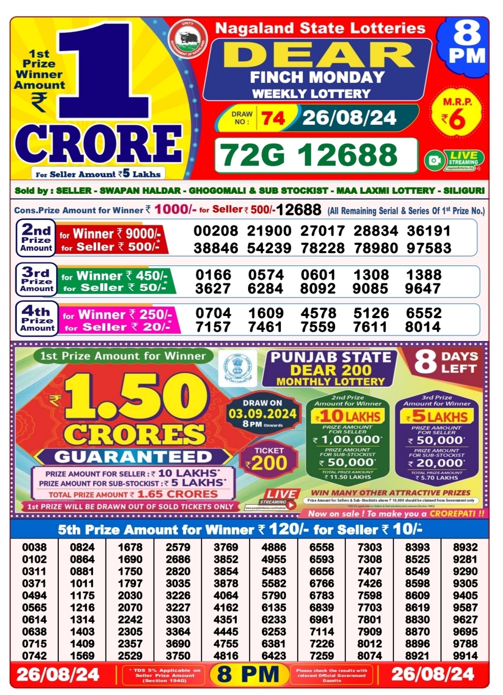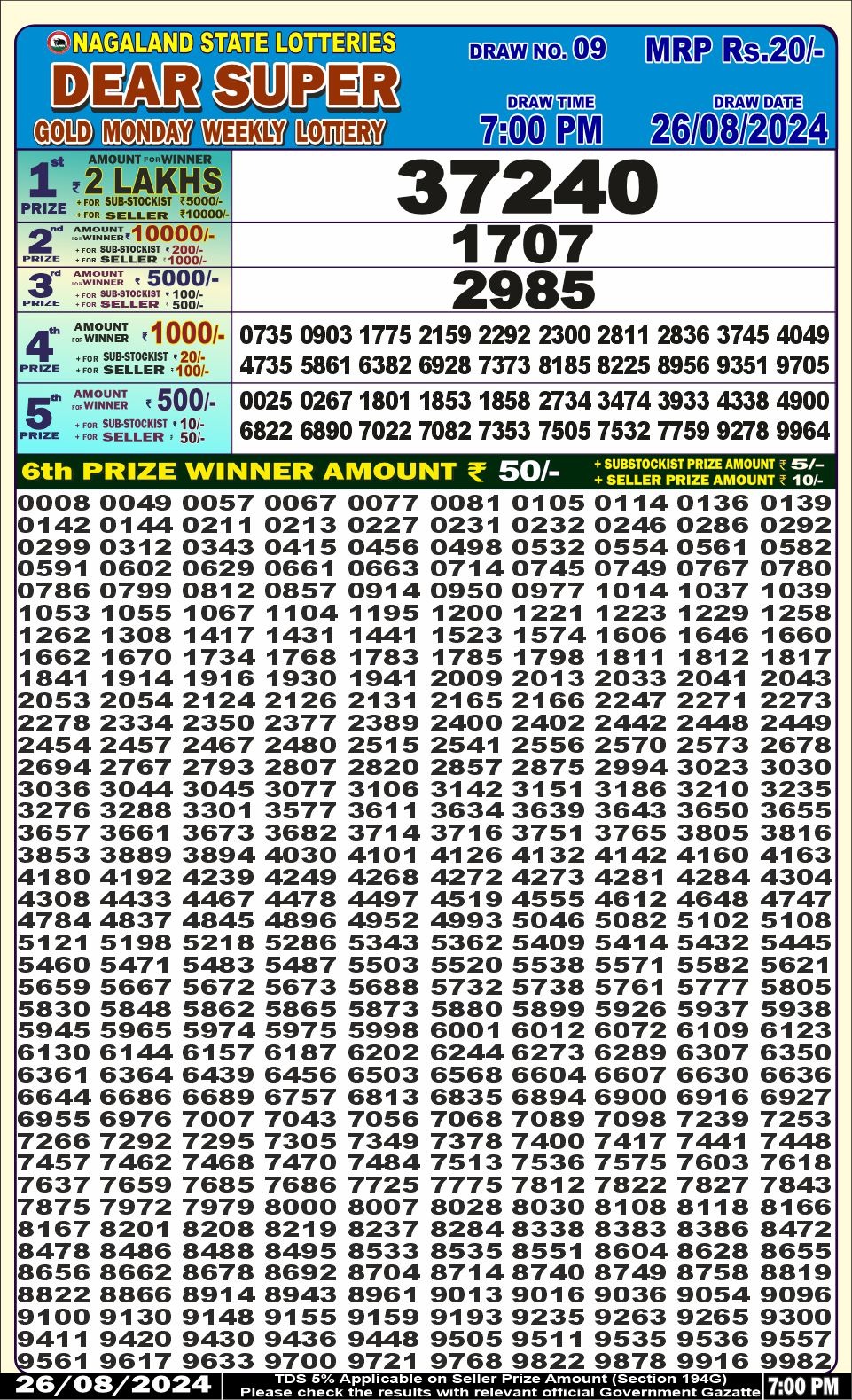 Dear super 7pm lottery result 26-8-24