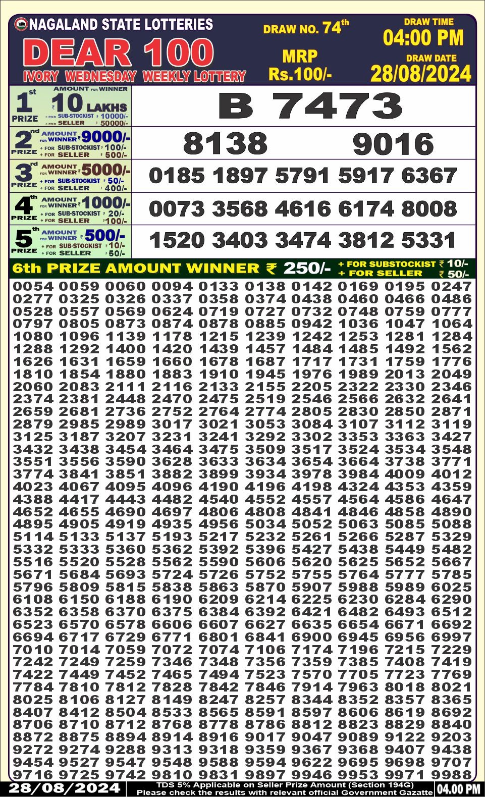 Dear100 4pm lottery result 28-8-24