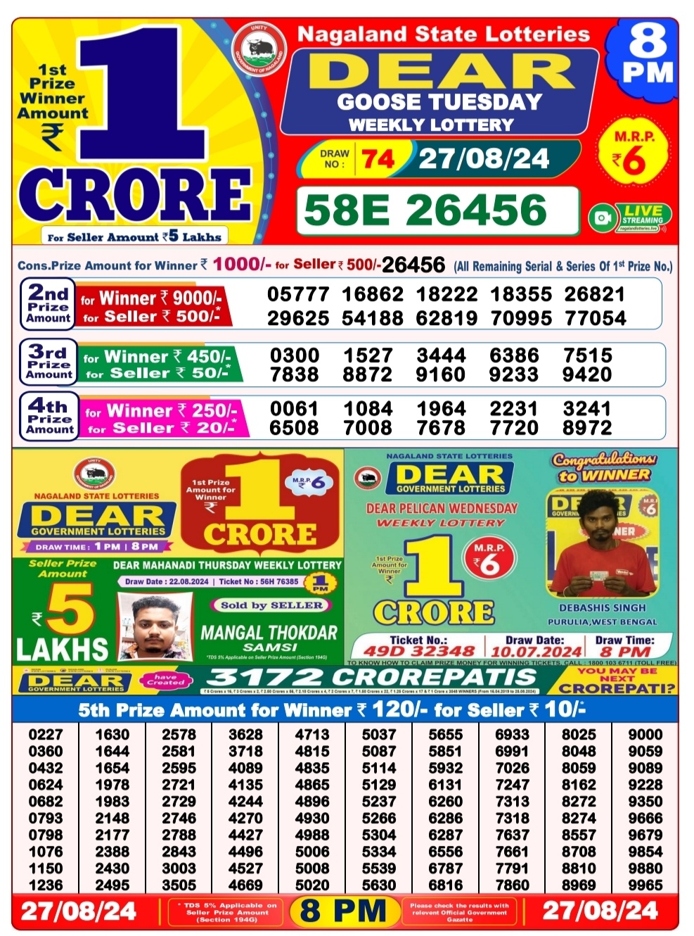 Dear 6pm lottery result 27-8-24