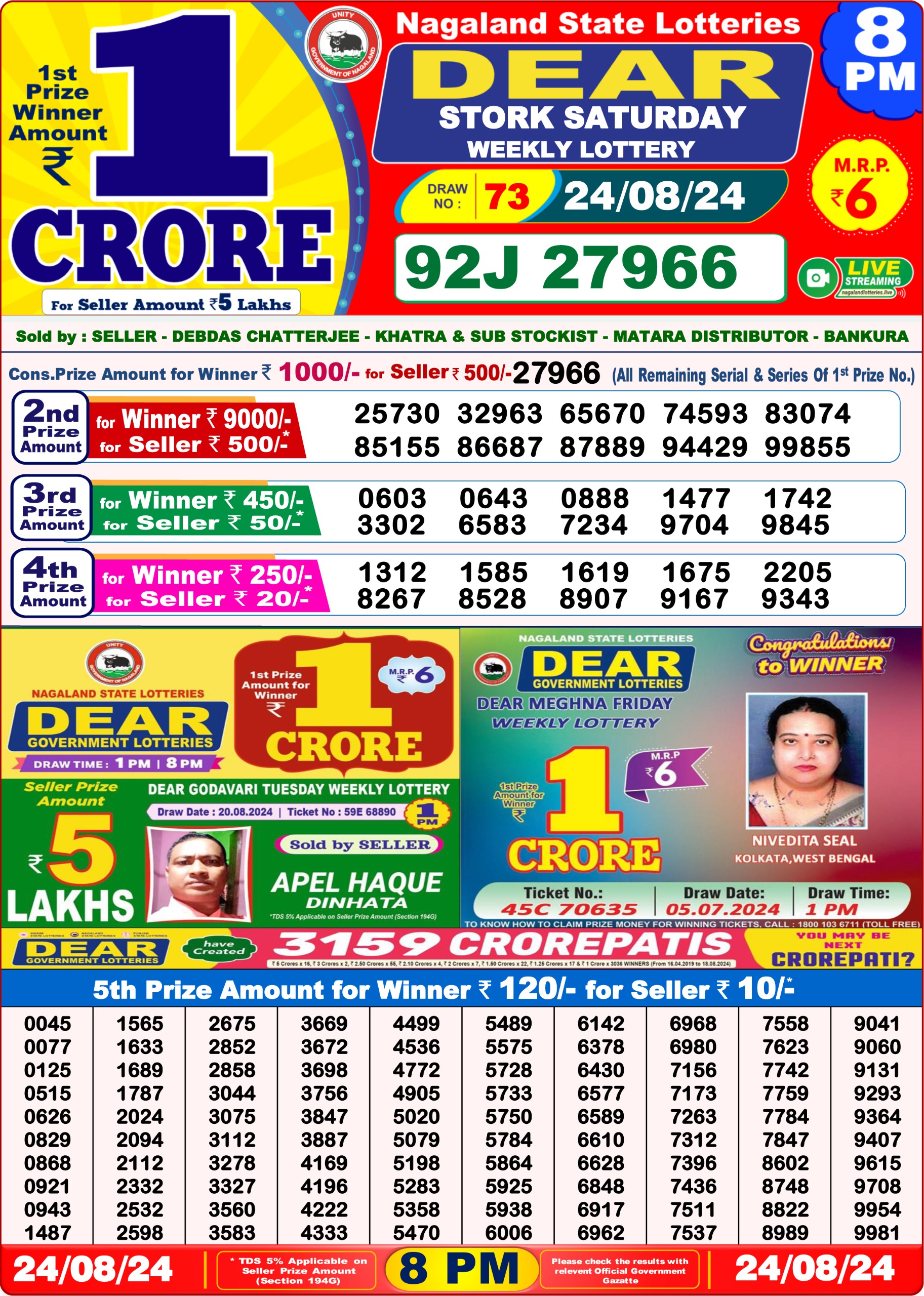 Dear Lottery Result Today 1 PM 6 PM 8 PM Lottery Sambad