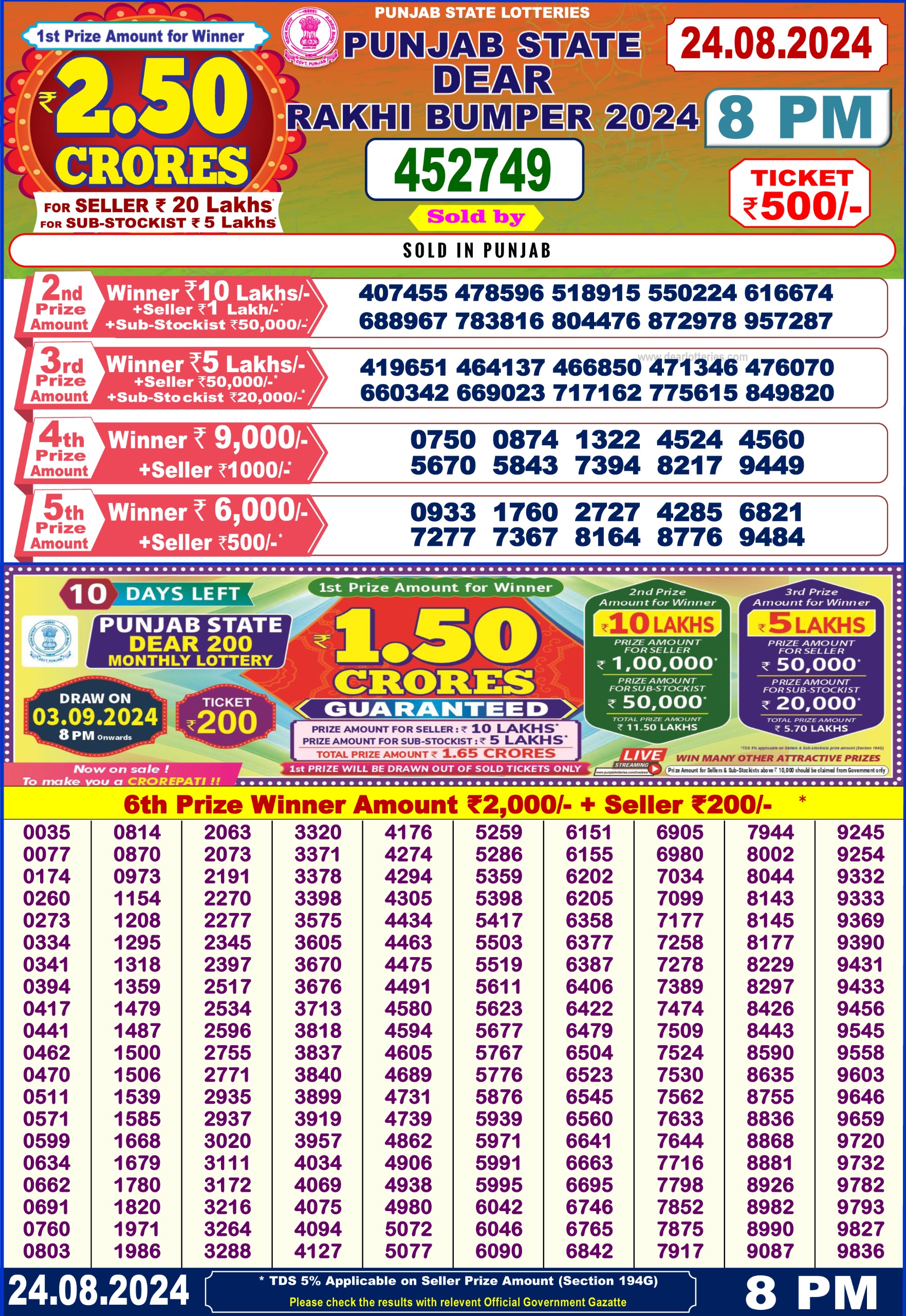 Punjab state 8pm dear rakhi bumper lottery result 24-8-24