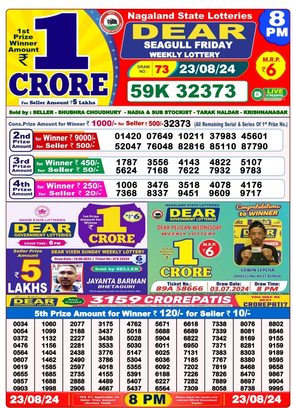 Dear Lottery Result Today 1 PM 6 PM 8 PM Lottery Sambad