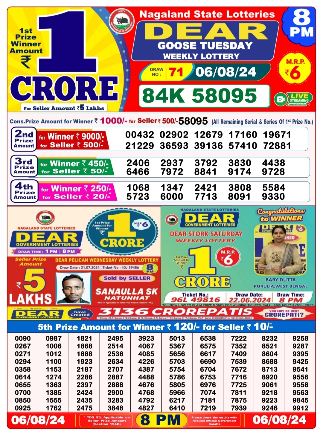 Dear Lottery Result Today 1 PM 6 PM 8 PM Lottery Sambad
