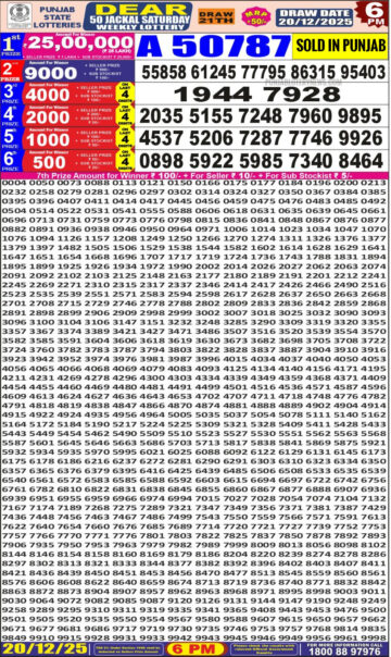 Punjab State Dear 50 6 PM Lottery Result 20.12.25