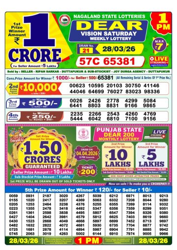 Dear Lottery Result 28.03.26 1PM Today Dear Morning