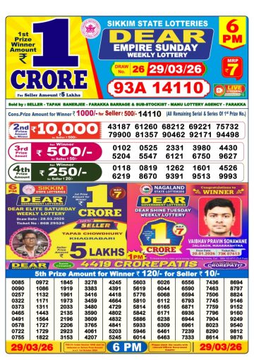 Dear Lottery Result 29.03.26 6PM Today Dear Day Result