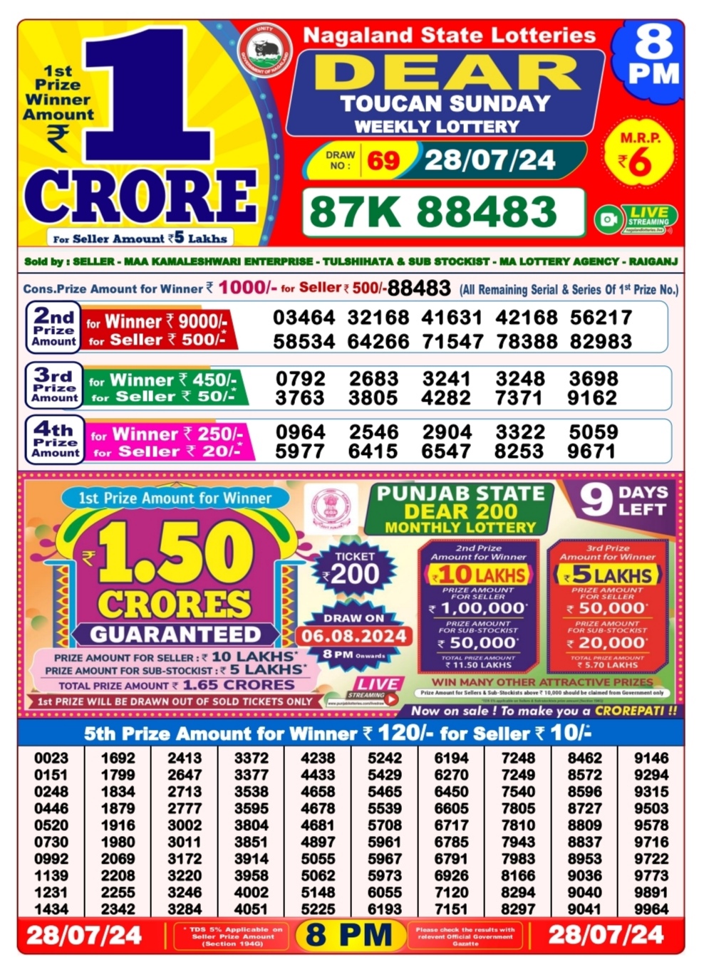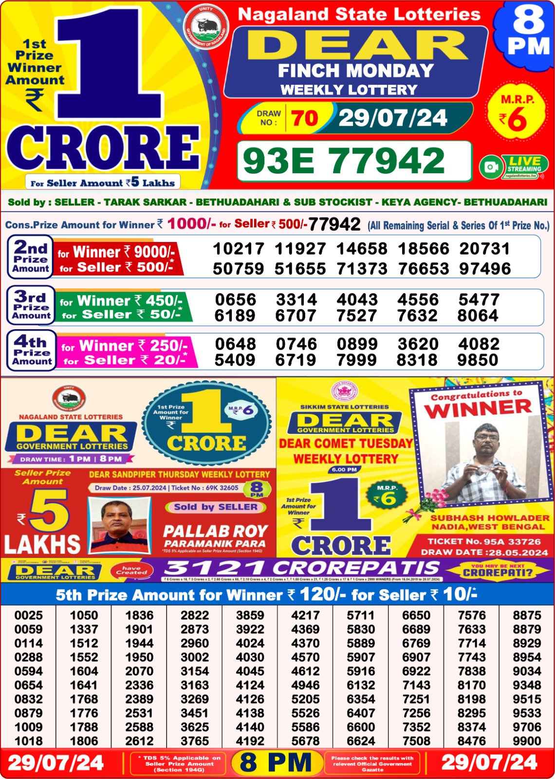 Dear Lottery Result Today 1 PM 6 PM 8 PM Lottery Sambad