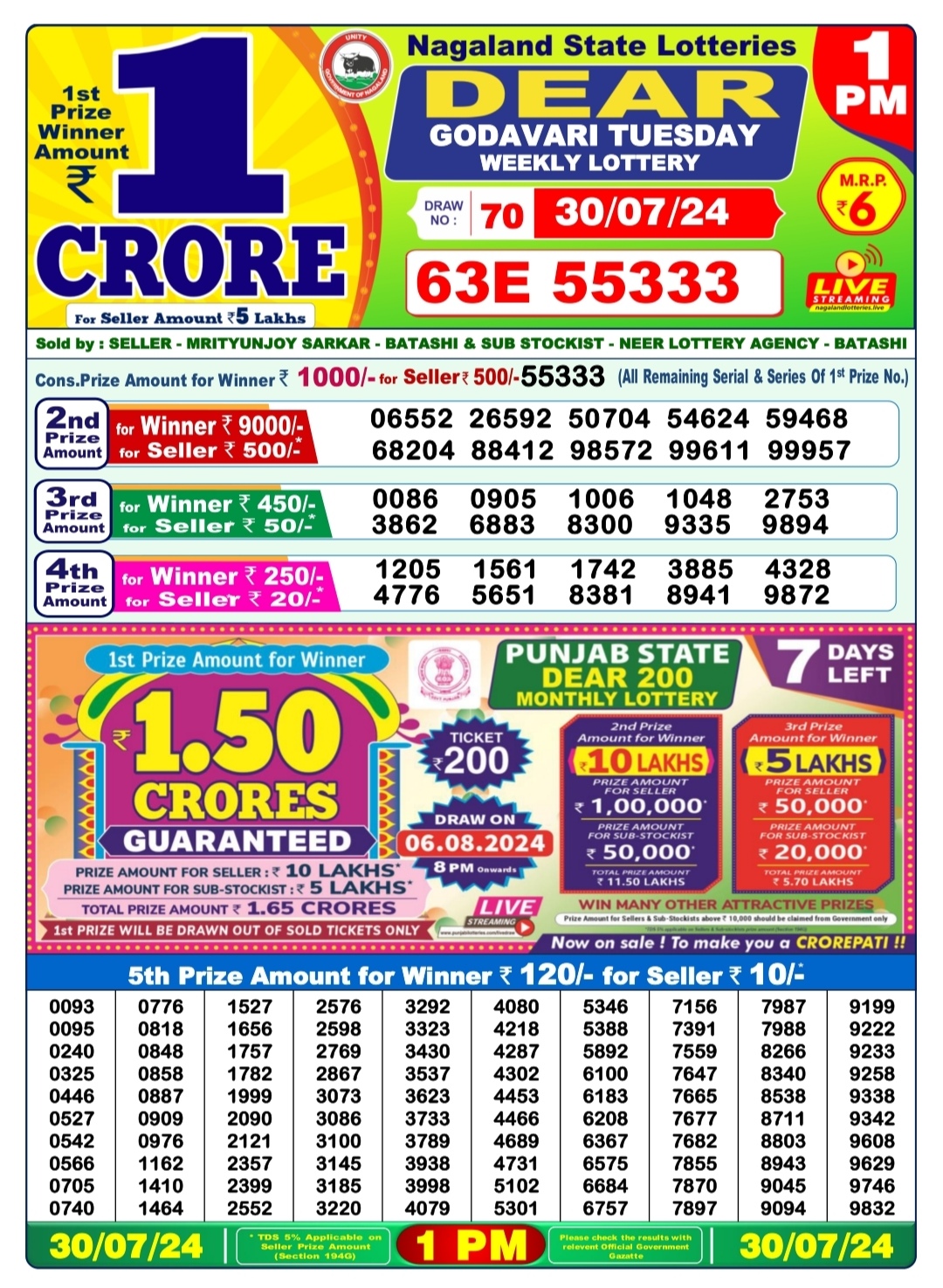 Dear Lottery Result 06.11.25 1PM Today Dear Morning