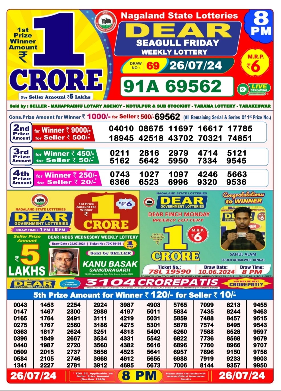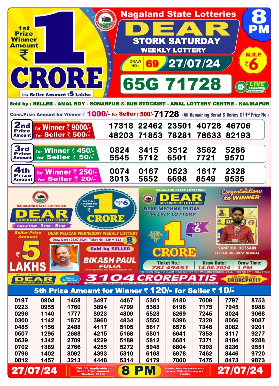 Dear Lottery Result Today 1 PM 6 PM 8 PM Lottery Sambad