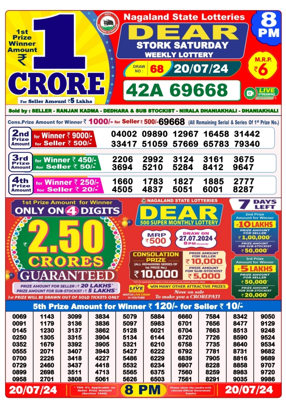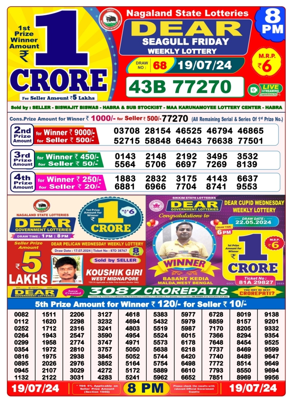Dear Lottery Result Today 1 PM 6 PM 8 PM Lottery Sambad
