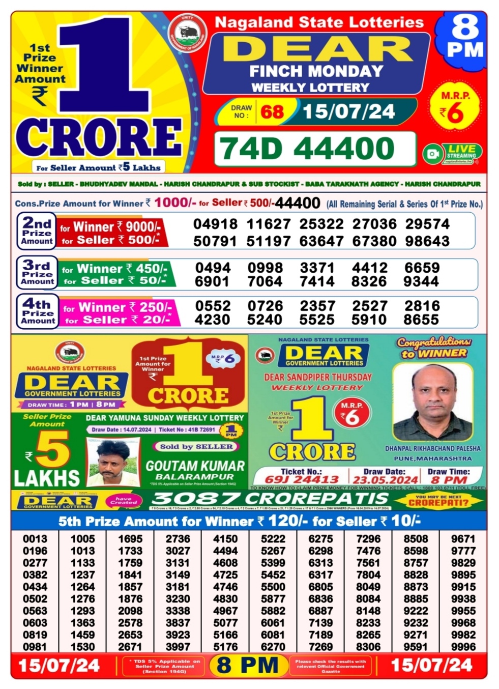 Dear Lottery Result Today 1 PM 6 PM 8 PM Lottery Sambad