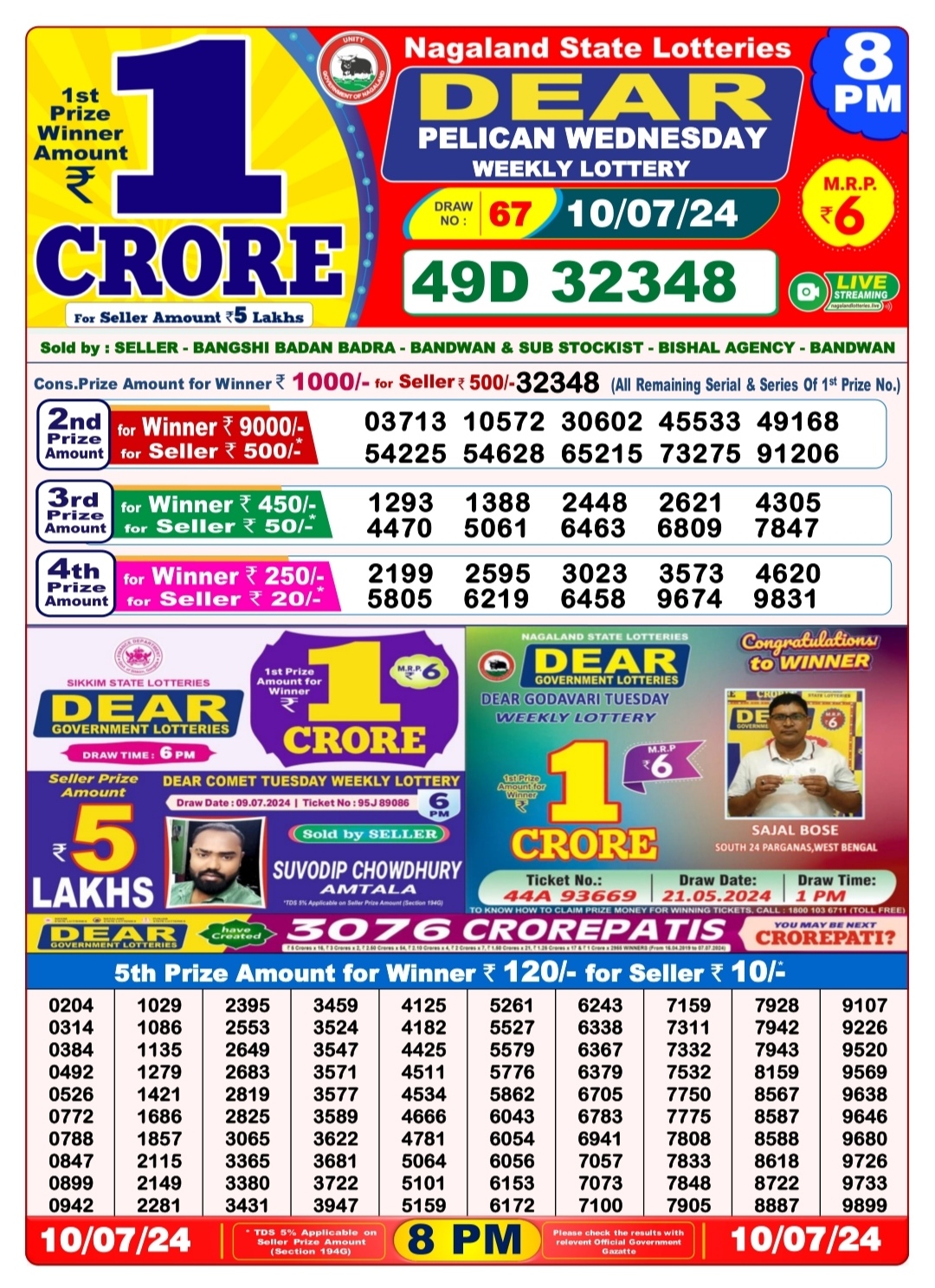 Dear Lottery Result Today 1 PM 6 PM 8 PM Lottery Sambad