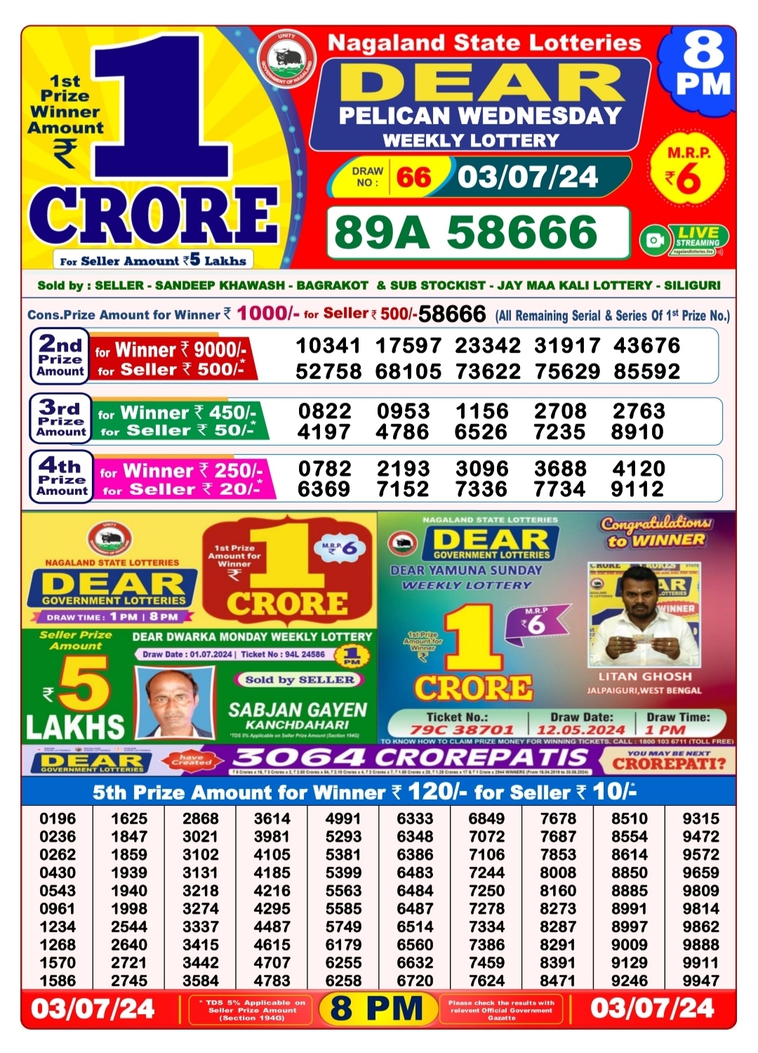 Dear Lottery Result Today 1 PM 6 PM 8 PM Lottery Sambad